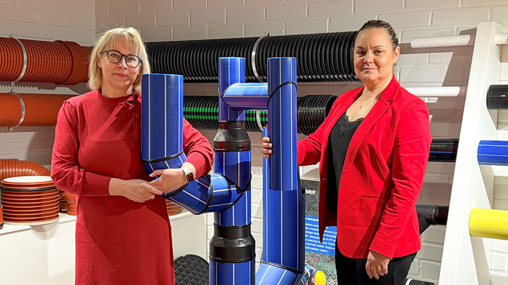 Kati Perttilä ja Viktoria Juuti iloitsevat, että Uponorin tekemä pitkäjänteinen työ tuotetietojen parissa sai arvoisensa tunnustuksen.