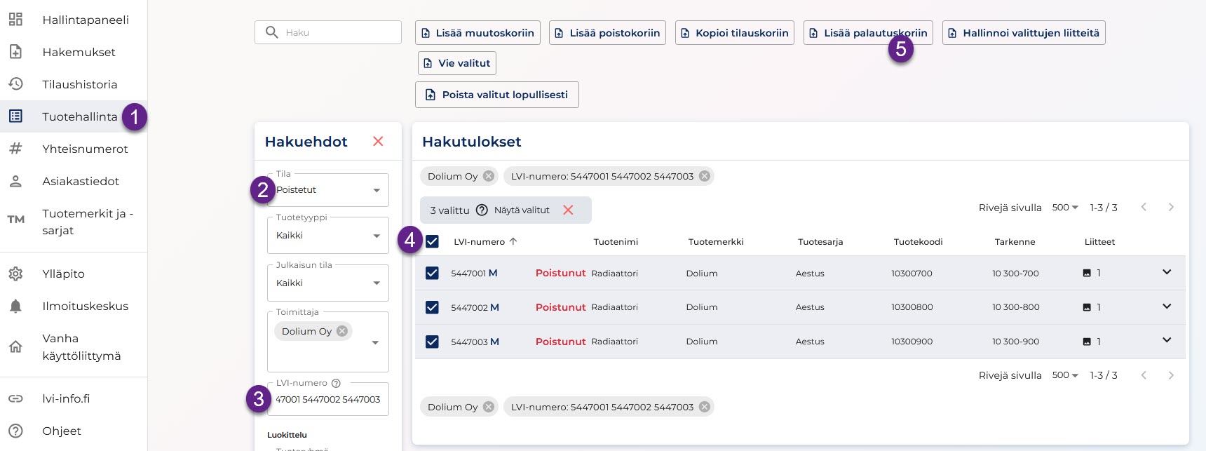 LVI-INFOn hallintapalveluun on lisätty uusi ominaisuus. Aikaisemmin poistetut eli arkistoidut tuotteet pystyi palauttamaan takaisin aktiiviseksi lähettämällä LVI-INFOon luettelon palautettavista LVI-numeroista. Nyt voit palauttaa arkistoidut tuotteesi takaisin aktiivisiksi suoraan palautuskorin kautta.