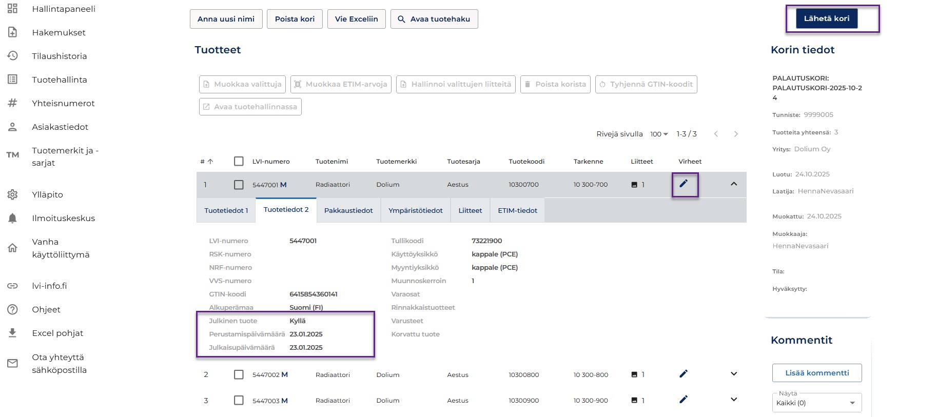 Korissa Tuotetiedot 2 -välilehdellä näkyy automaattisesti, että tuote on julkinen ja perustamispäivämääräksi on asetettu tuotteen alkuperäinen perustamispäivämäärä. Tarkista tuotteiden tiedot ja muokkaa niitä tarvittaessa kynäpainikkeella avautuvassa näkymässä. Lähetä kori käsiteltäväksi.